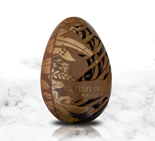 Moulage en chocolat dentelle ajouré – 150gr – lait 38%, garni de fritures de Pâques en chocolat – 150gr – Lait 38% et 50% origine Madagascar